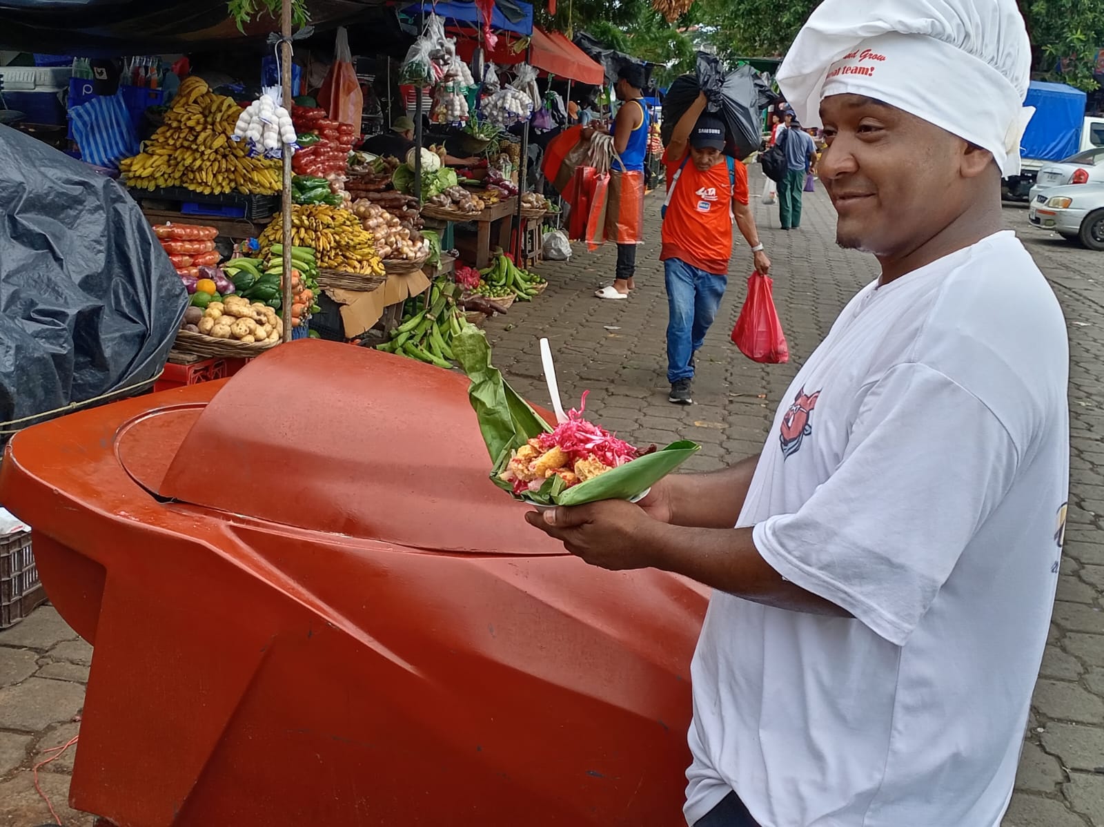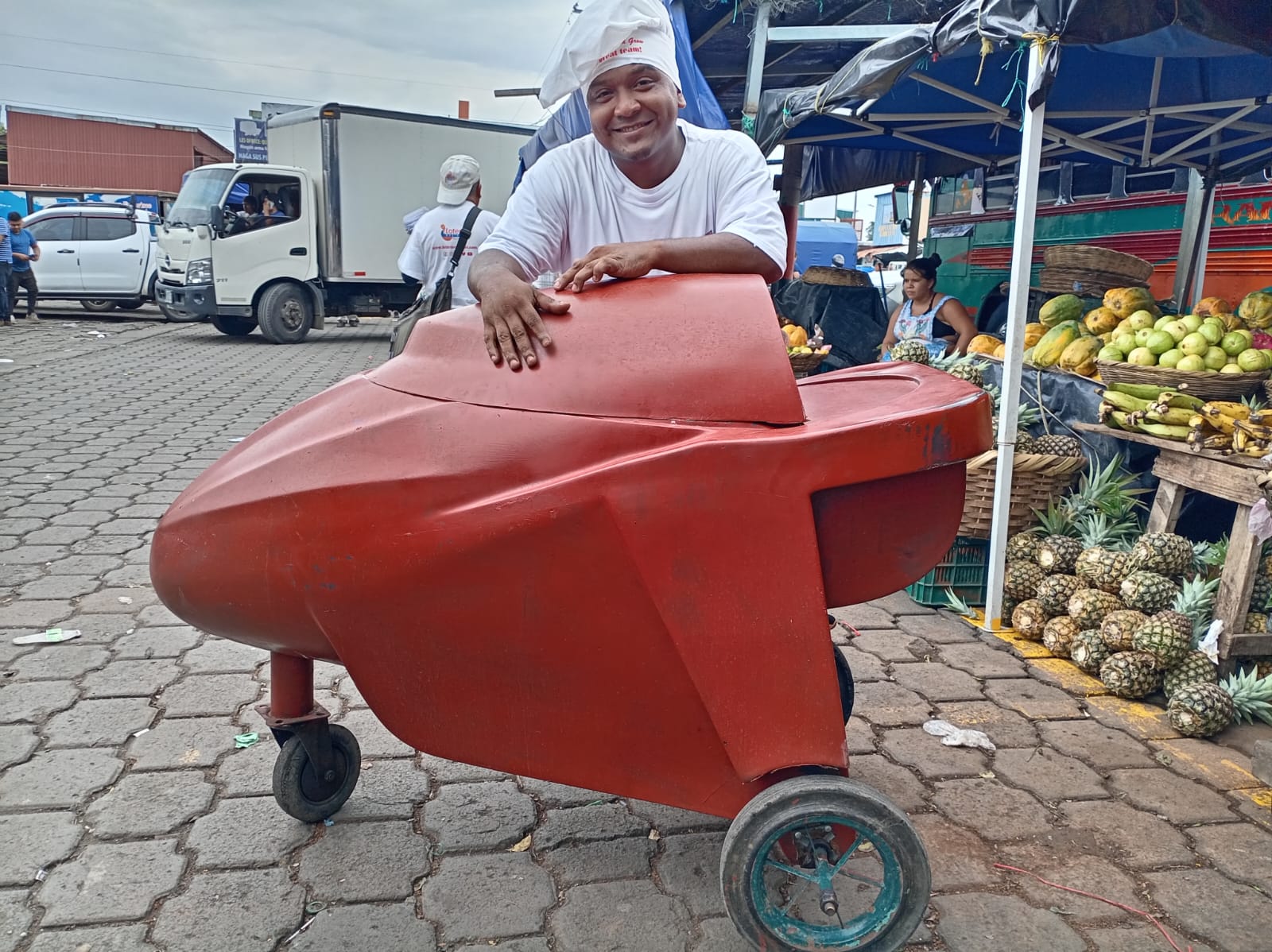 “Decidí trabajar en algo nuevo y diferente en mi vida. Estoy vendiendo vigorón desde que empezó este año y lo hago con la esperanza de salir adelante, paso a paso y con la bendición de Dios”, cuenta García, mientras acomoda sus insumos en el peculiar vehículo que muchos confunden con una bala, una aeronave o incluso un misil, por su forma llamativa.