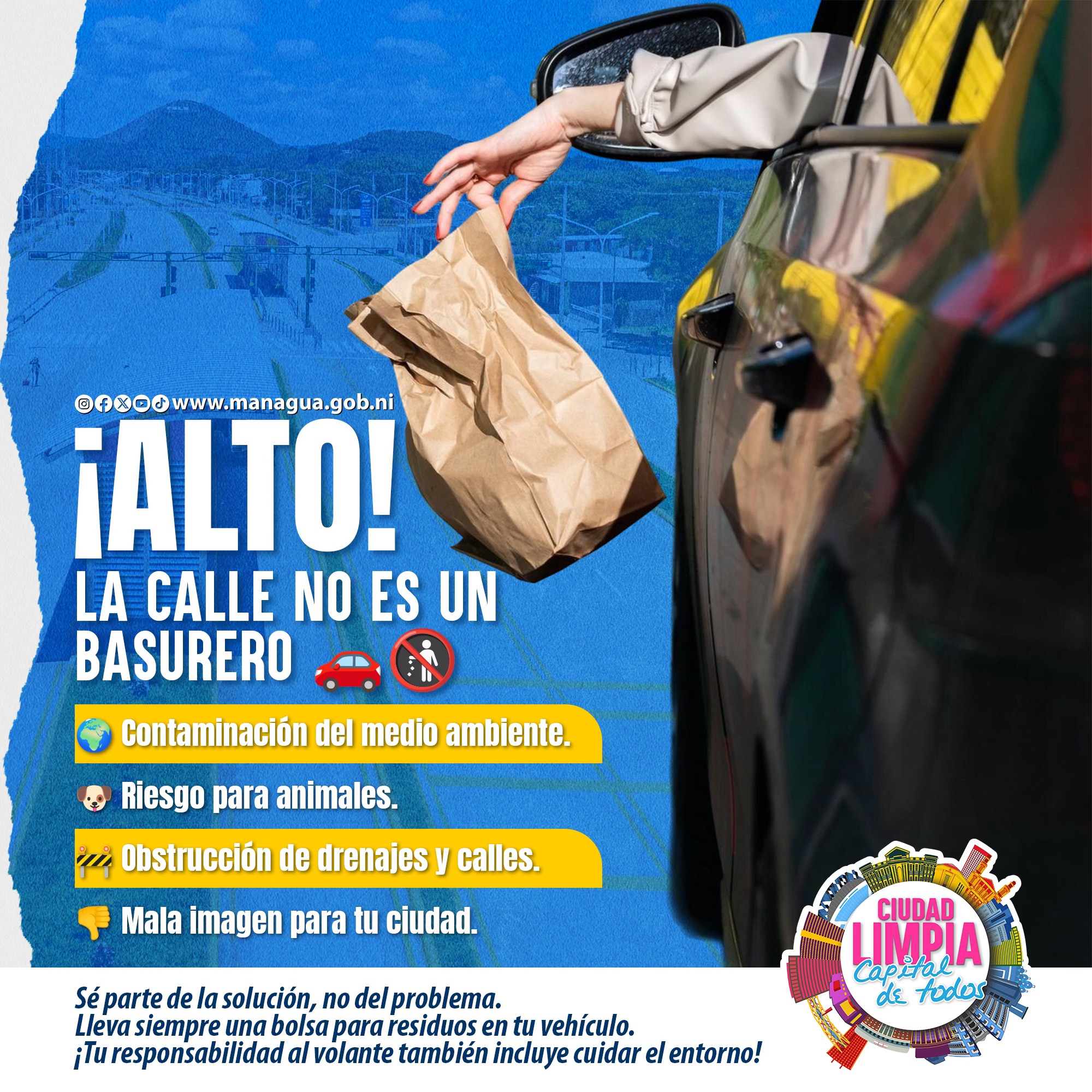 Una de las acciones que ejecuta la Alcaldía de Managua para sensibilizar a la población sobre el tema es la reciente campaña “¡Alto! La calle no es un basurero”, que insta a cada conductor a portar una bolsa en su vehículo para depositar la basura.