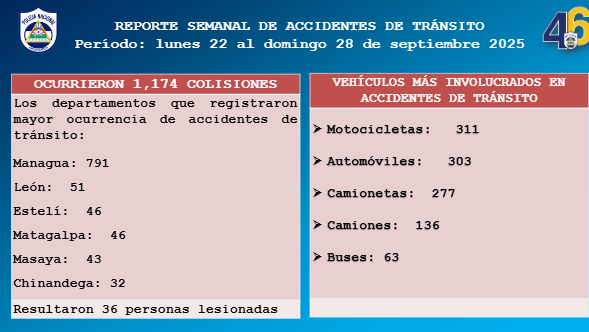 De acuerdo al último reporte semanal de la Dirección de Seguridad de Tránsito Nacional (DSTN) que comprendió del lunes 22 al domingo 28 de septiembre, entre los departamentos que registraron la mayor cantidad de accidentes viales en ese periodo está Managua con 791 casos, le sigue León con 51; Estelí y Matagalpa con 46 cada uno, Masaya con 43, finalmente Chinandega con 32.