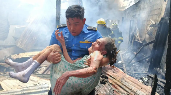 La imagen del bombero que sale de la zona del incendio con la anciana en brazos, se ha viralizado en redes sociales.