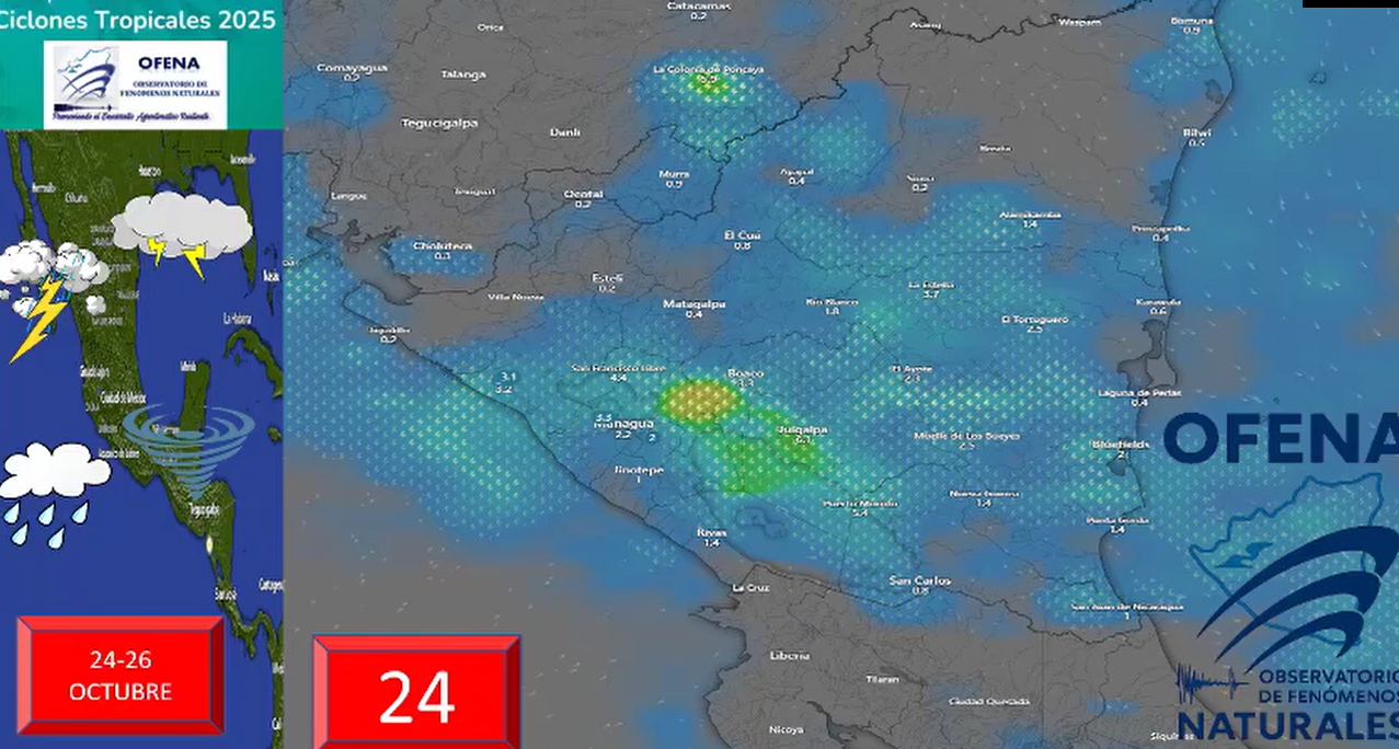 “Se esperan que continúen las lluvias en Managua, Masaya, Granada, Rivas, también en la parte de Estelí, Jinotega, Matagalpa, Boaco hasta Punta Gorda", añadió.